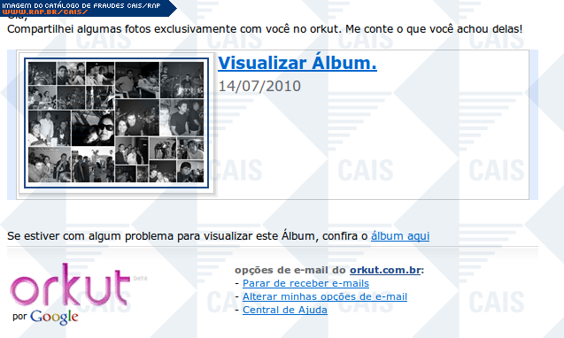 | comentário | Suposto email do Orkut com mensagem de contato que teria compartilhado fotos com a vítima no sistema. Os links da fraude, que levariam até as fotos compartilhadas, direcionam a vítima para malware já retirado da página no momento da análise. | |