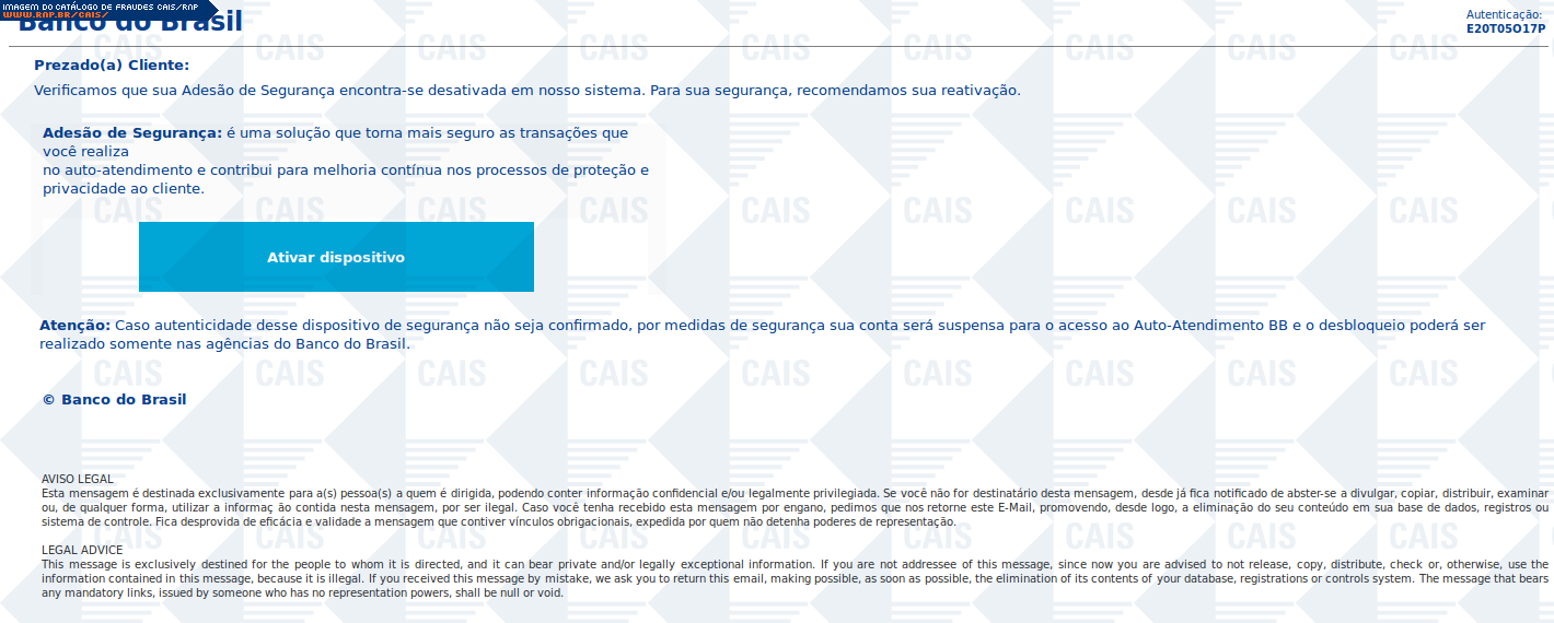 | comentário | Mensagem se passando pelo Banco do Brasil fornecendo atualização para dispositivo de segurança para acesso ao Internet Banking. O link para ativação de tal dispositivo leva a conteúdo malicioso não disponível no momento da análise. | |