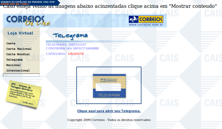 | comentário | Mensagem falsa notificando a vítima sobre suposto telegrama urgente em seu nome. A fraude tenta passar a impressão de que o telegrama foi enviado através do sistema dos Correios. O link para abrir o telegrama leva a uma página falsa dos Correios com a mensagem... (leia mais) | |