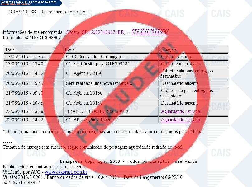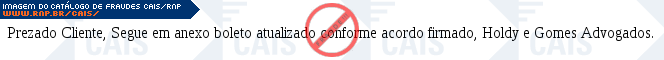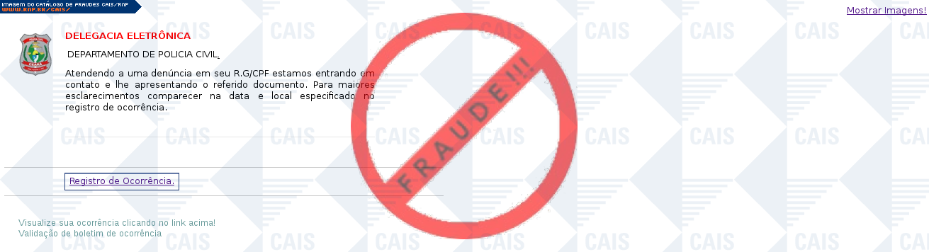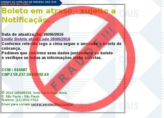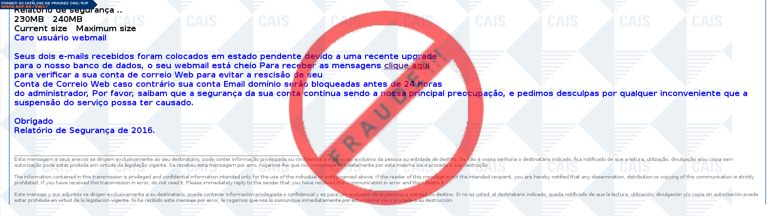 Esta página tem função informativa e educativa. Exibe uma coleção de imagens de phishing scam (fraudes eletrônicas) ou malware (código malicioso) veiculados por meio de spam (e-mail não-solicitado). Trata-se de conteúdo exemplificativo, não exaustivo, uma vez que não é possível contemplar todos os casos de fraudes existentes. Assim, caso você tenha conhecimento de um exemplar que não esteja aqui presente, isto não significa que não seja válido ou real. Inclusive incentivamos que você o envie para análise do CAIS para que, se for o caso, passe a integrar o nosso acervo.