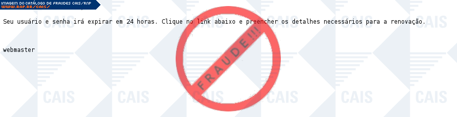 | comentário | O usuário recebe uma mensagem dizendo que seu usuário e senha irão expirar em 24 horas, sendo necessário fazer uma renovação no link disponibilizado, entretanto a página é falsa e criada para roubar os dados do e-mail da vítima. | |