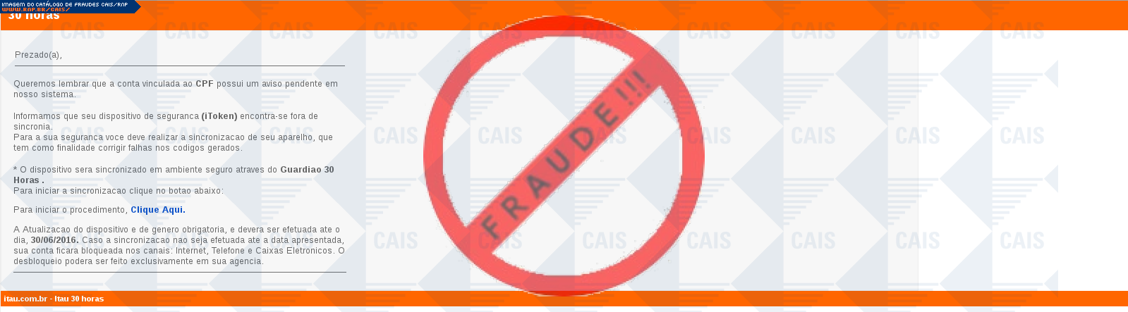 | comentário | A vítima recebe uma mensagem informando que seu cartão itoken referente a uma conta no banco Itaú não está sincronizado sendo necessário realizar a sincronização no link disponível, entretanto a página é falsa criada para roubar os dados bancários do usuário.... (leia mais) | |