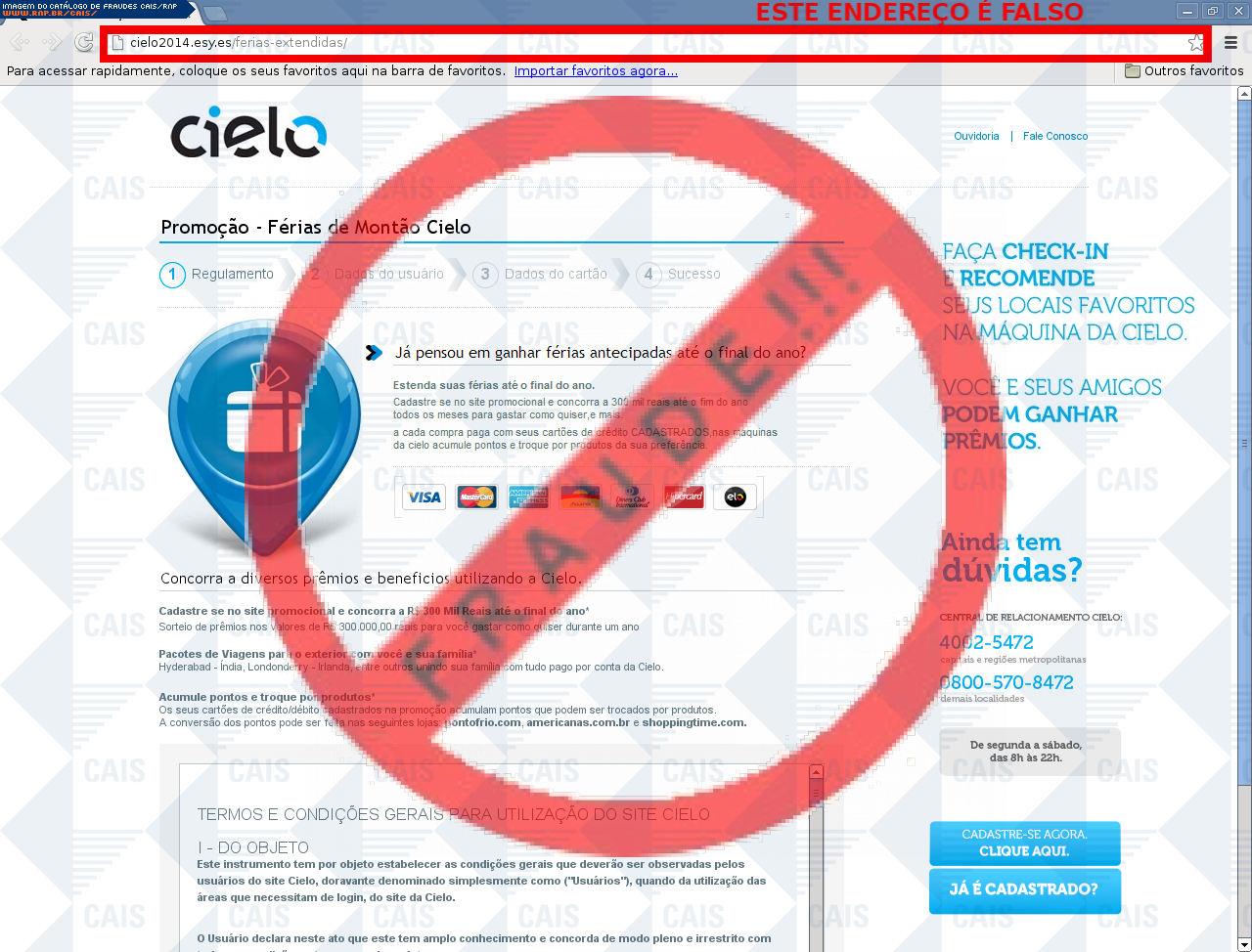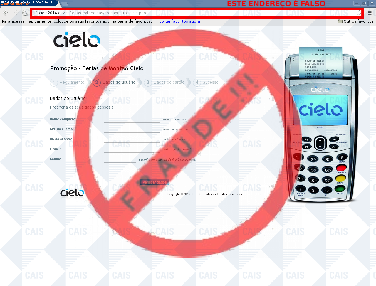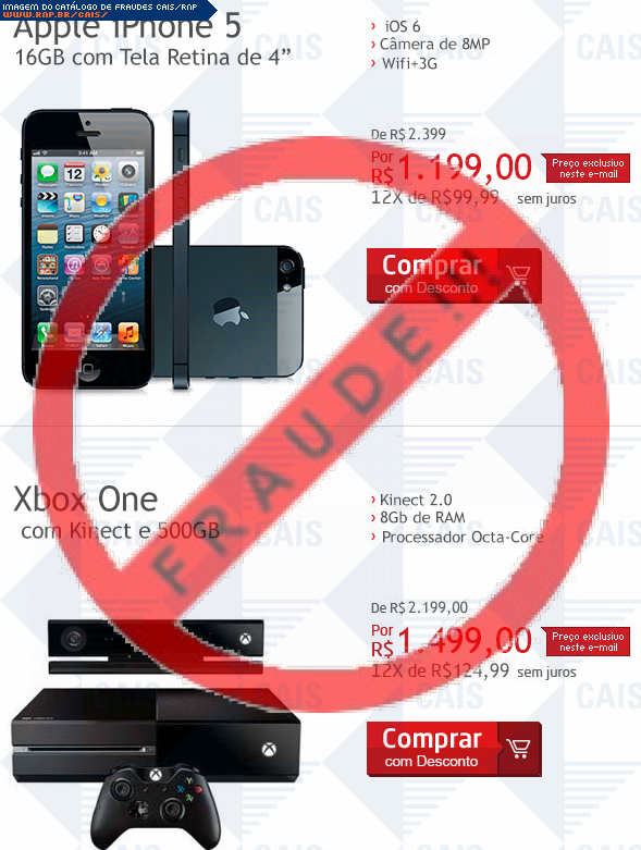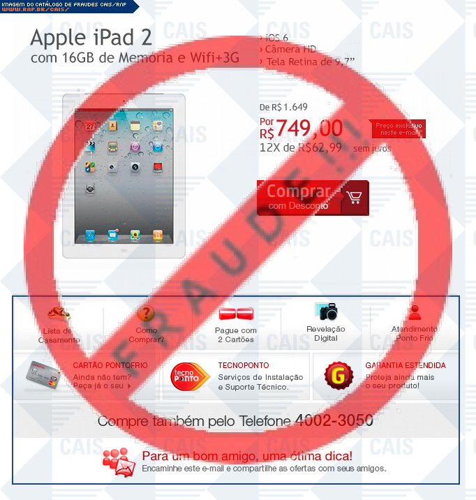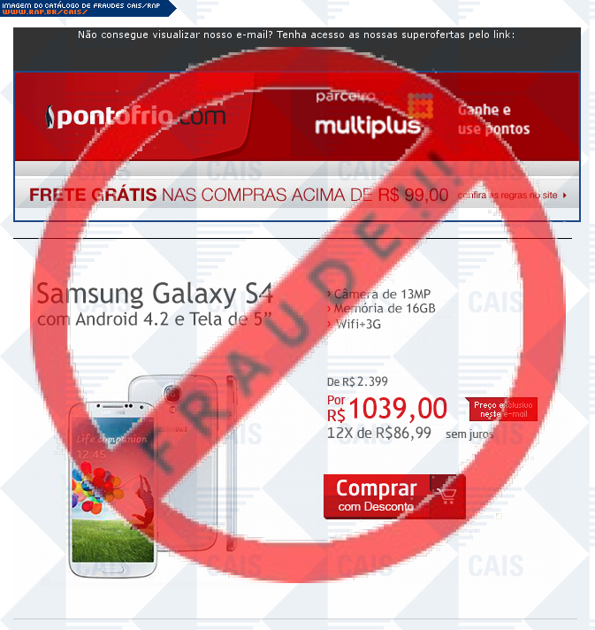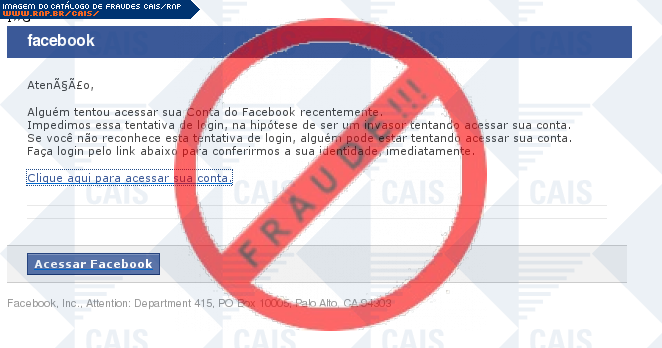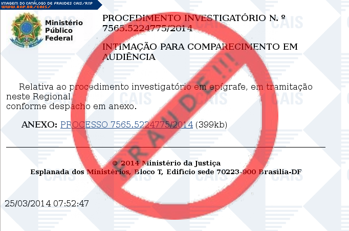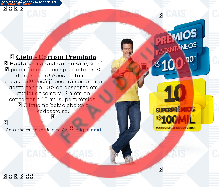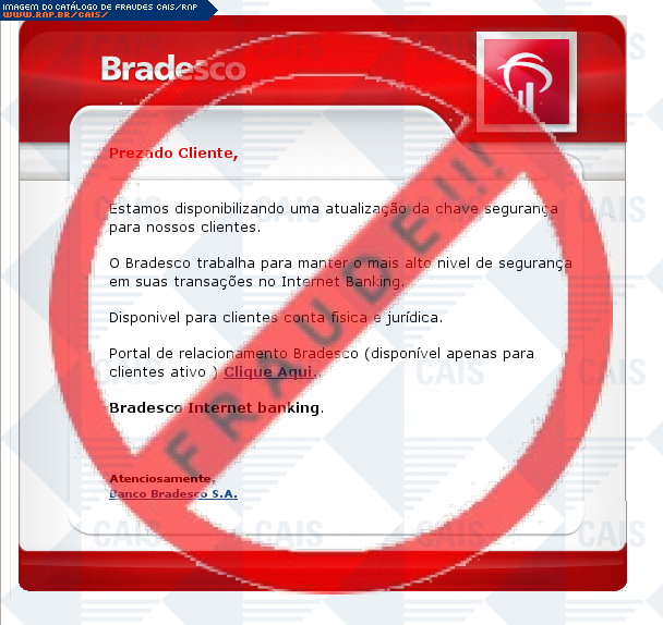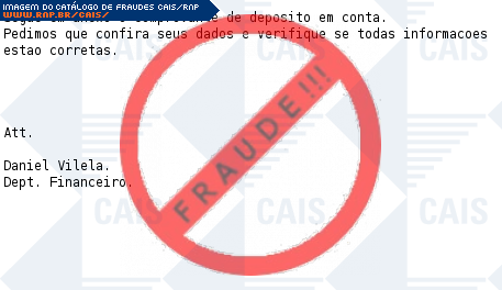 Esta página tem função informativa e educativa. Exibe uma coleção de imagens de phishing scam (fraudes eletrônicas) ou malware (código malicioso) veiculados por meio de spam (e-mail não-solicitado). Trata-se de conteúdo exemplificativo, não exaustivo, uma vez que não é possível contemplar todos os casos de fraudes existentes. Assim, caso você tenha conhecimento de um exemplar que não esteja aqui presente, isto não significa que não seja válido ou real. Inclusive incentivamos que você o envie para análise do CAIS para que, se for o caso, passe a integrar o nosso acervo.
