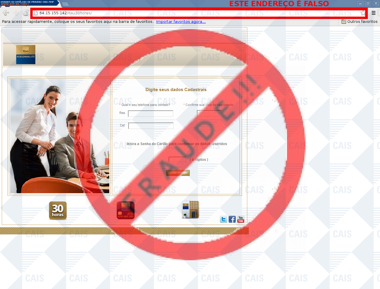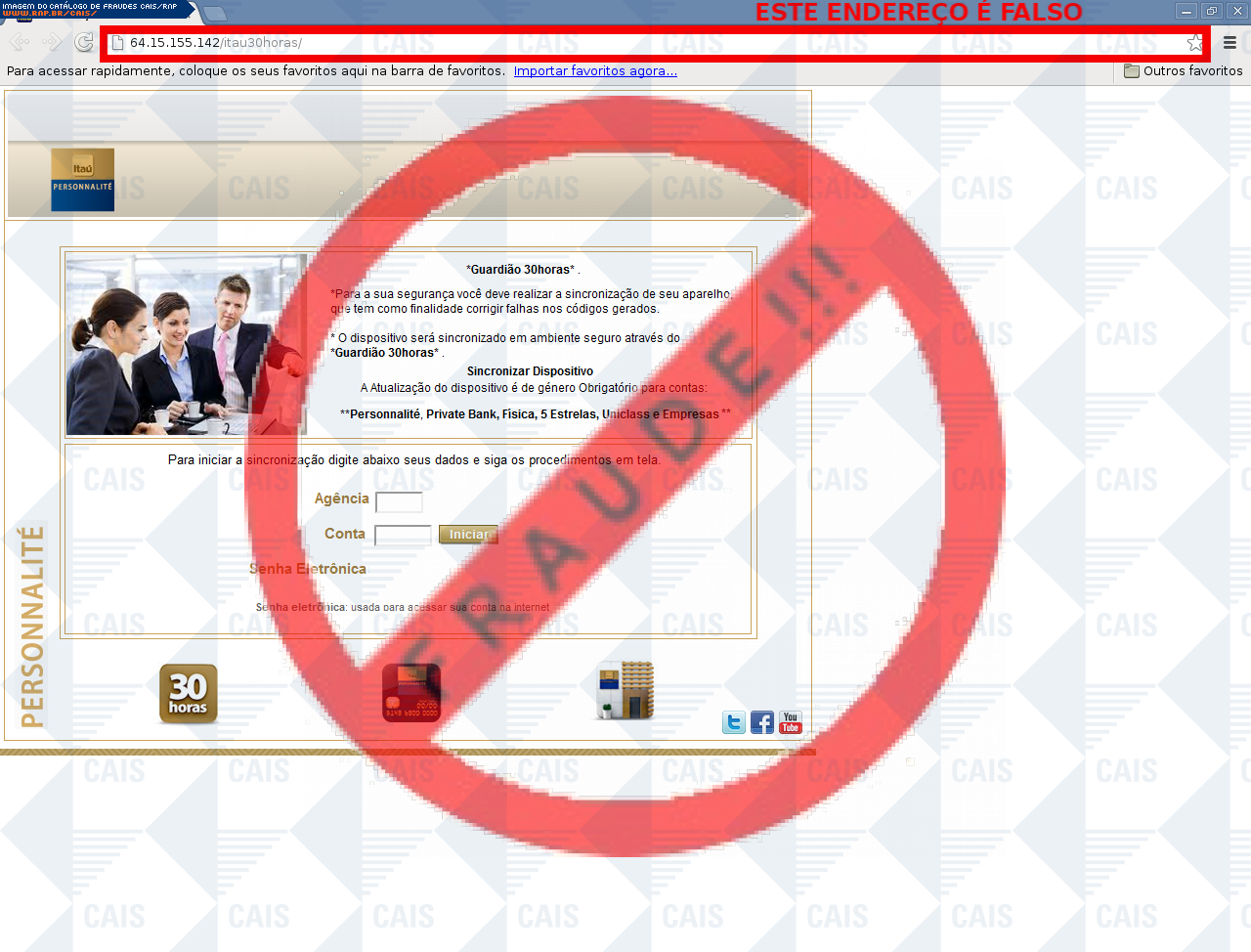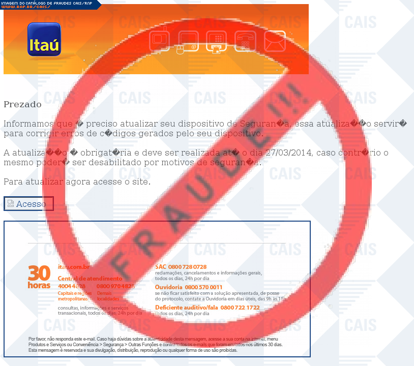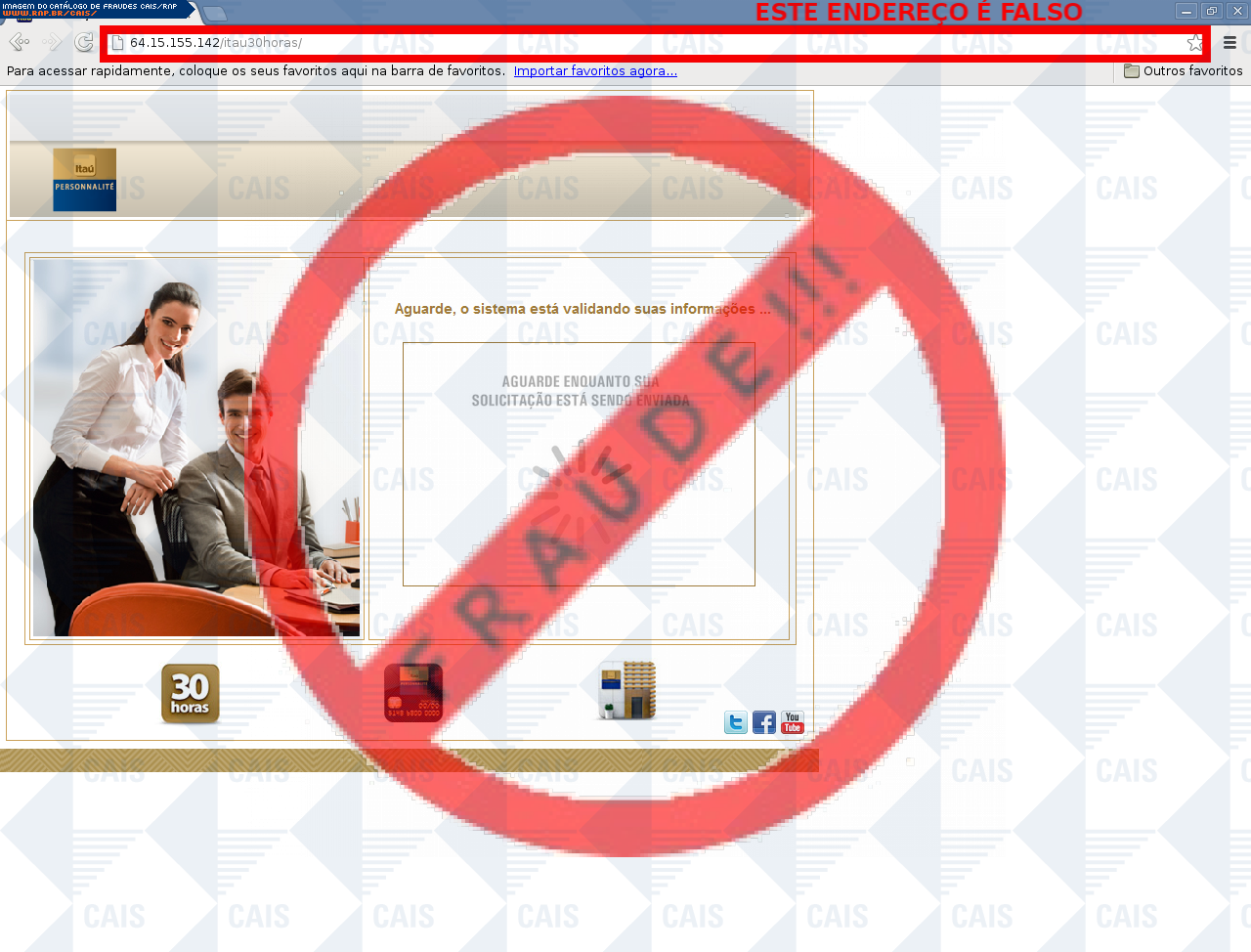 Esta página tem função informativa e educativa. Exibe uma coleção de imagens de phishing scam (fraudes eletrônicas) ou malware (código malicioso) veiculados por meio de spam (e-mail não-solicitado). Trata-se de conteúdo exemplificativo, não exaustivo, uma vez que não é possível contemplar todos os casos de fraudes existentes. Assim, caso você tenha conhecimento de um exemplar que não esteja aqui presente, isto não significa que não seja válido ou real. Inclusive incentivamos que você o envie para análise do CAIS para que, se for o caso, passe a integrar o nosso acervo.