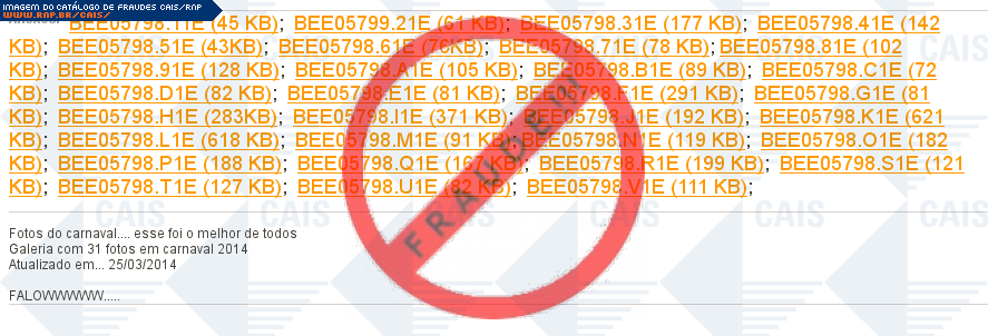 | comentário | A vítima recebe uma mensagem, contendo várias fotos do carnaval de 2014, mas ao clicar no link para visualizar essas fotos, inicia-se o download de um malware. | |