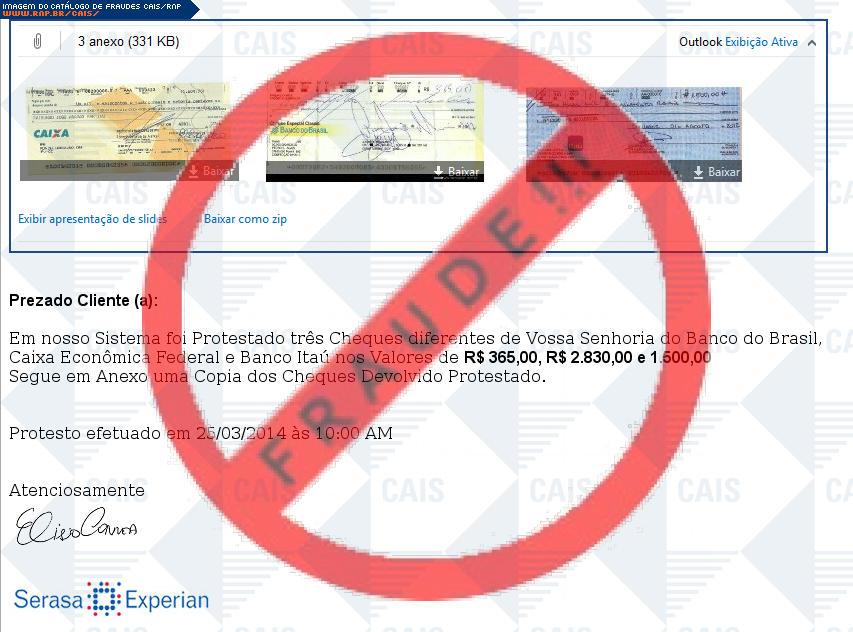 | comentário | A vítima recebe uma mensagem, contendo cheques protestados em anexo, mas ao clicar no link para visualizar, inicia-de o download de um malware. | |
