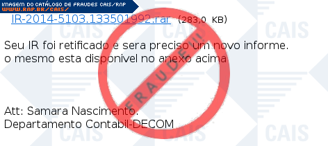 | comentário | A vítima recebe um email dizendo que seu imposto de renda foi retificado e que precisa ser feito um novo informe através de um link na mensagem. Contudo, o link leva ao download de um malware de nome Gen:Variant.Zusy.149244. | |
