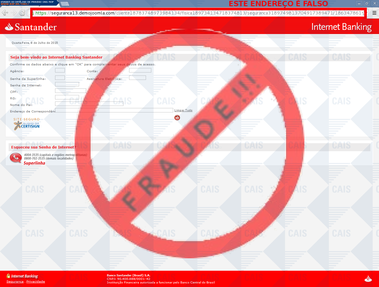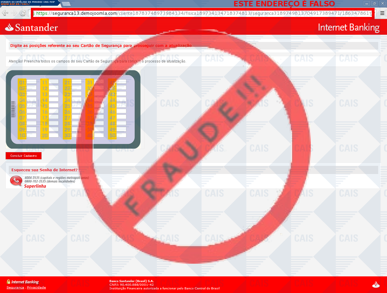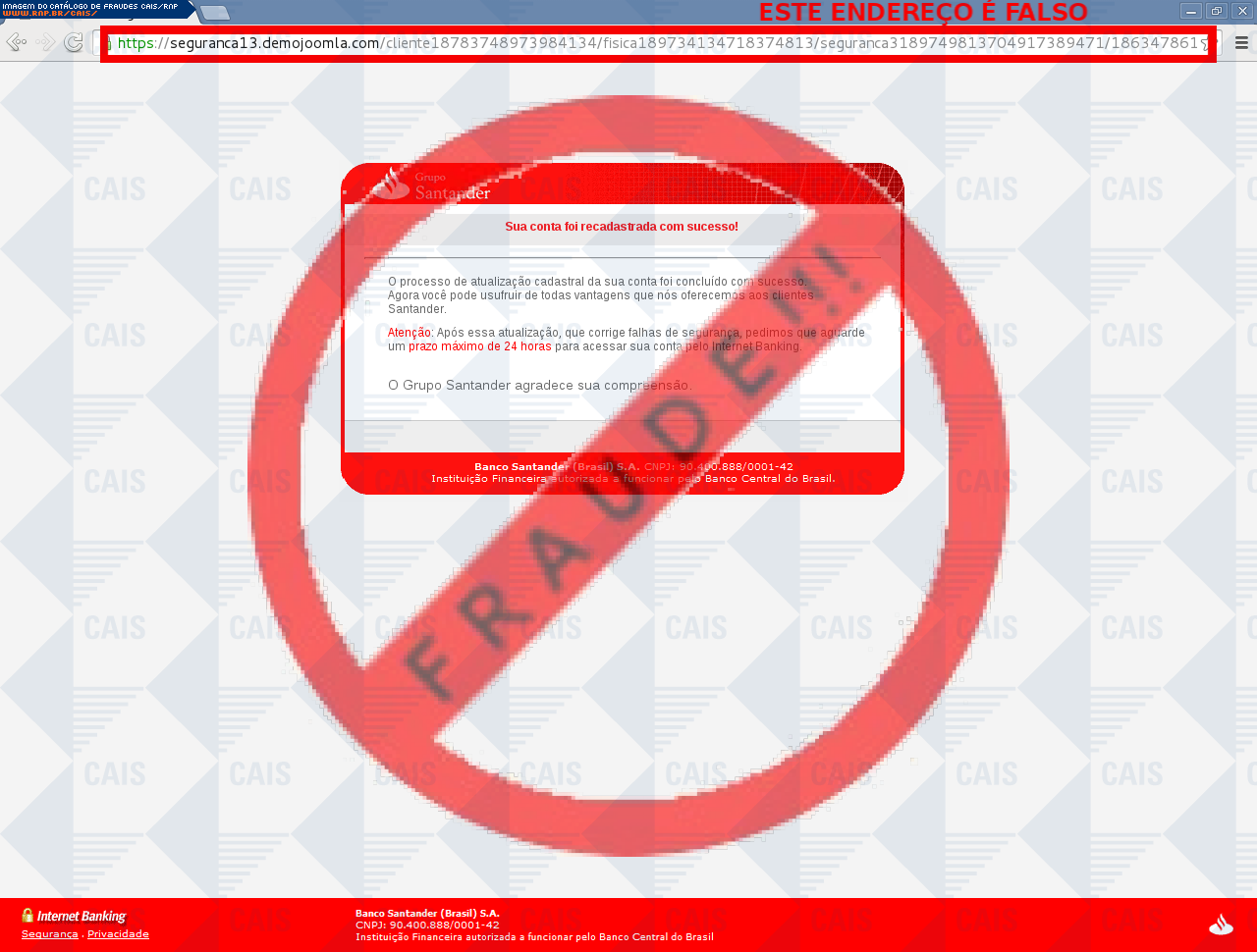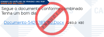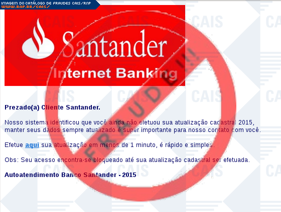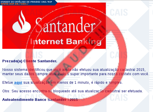 Esta página tem função informativa e educativa. Exibe uma coleção de imagens de phishing scam (fraudes eletrônicas) ou malware (código malicioso) veiculados por meio de spam (e-mail não-solicitado). Trata-se de conteúdo exemplificativo, não exaustivo, uma vez que não é possível contemplar todos os casos de fraudes existentes. Assim, caso você tenha conhecimento de um exemplar que não esteja aqui presente, isto não significa que não seja válido ou real. Inclusive incentivamos que você o envie para análise do CAIS para que, se for o caso, passe a integrar o nosso acervo.