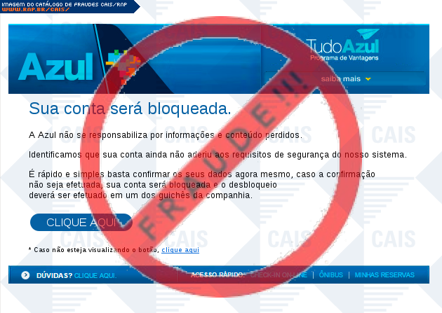 | comentário | A vítima recebe um email informando que sua conta no site de uma companhia aérea será bloqueada, e que necessita fazer a confirmação de seus dados através de um link na mensagem. Contudo, o link leva a uma página de phishing com o objetivo de roubar informações... (leia mais) | |