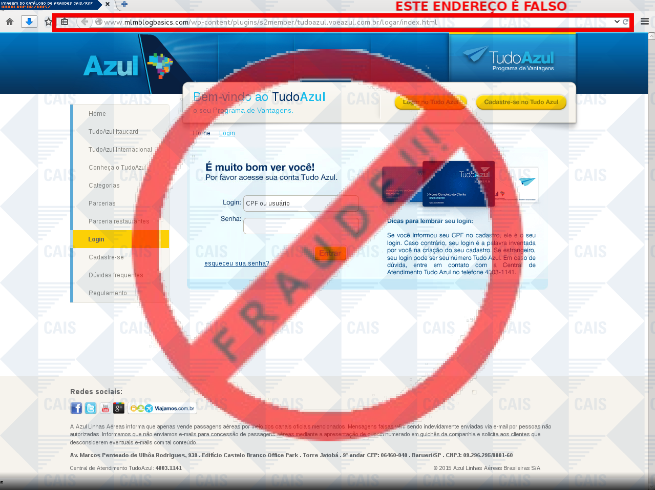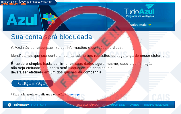 | comentário | O usuário recebe uma mensagem informando que sua conta na empresa aérea Azul será bloqueada sendo necessário fornecer algumas informações no link indicado, no entanto a página é falsa destinada a roubar os dados da vítima. | |