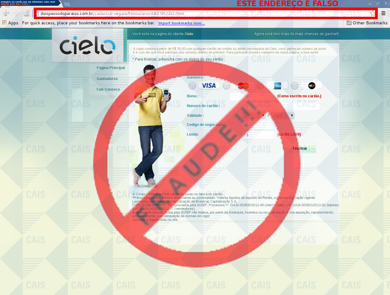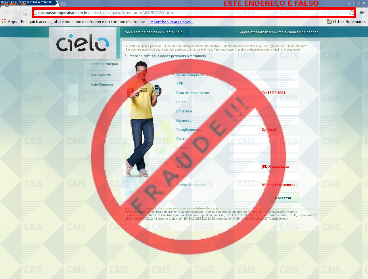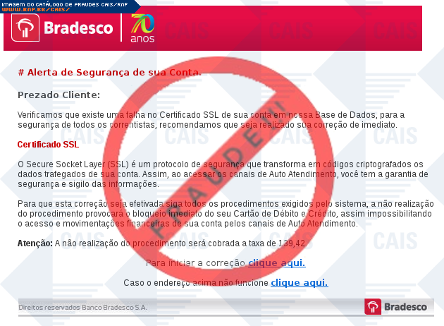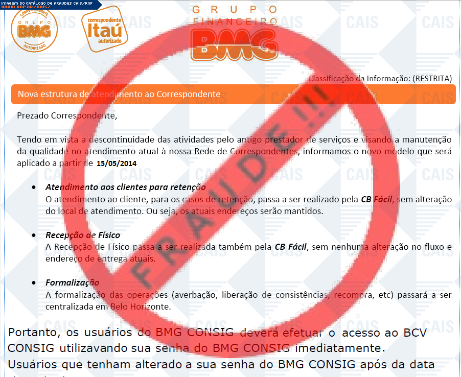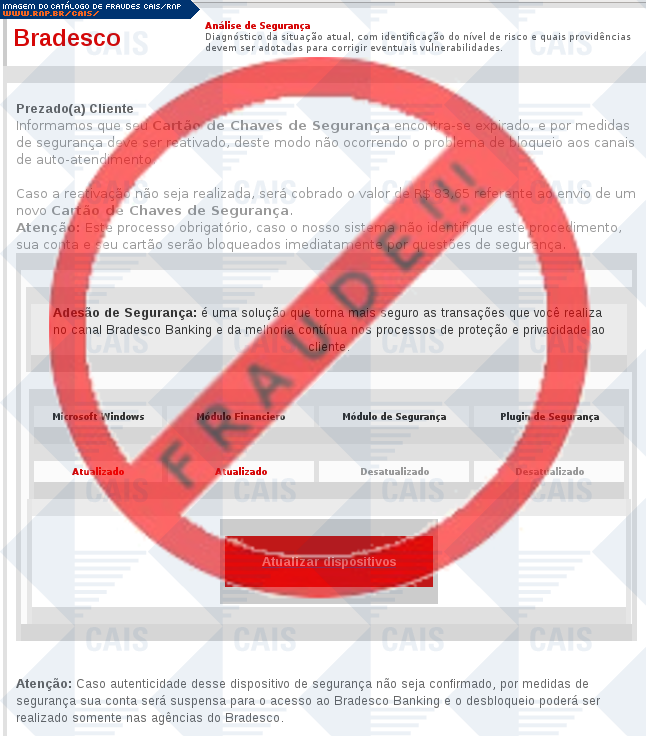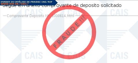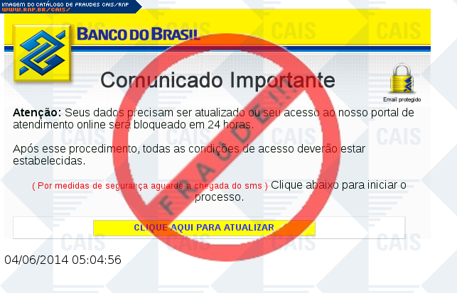 Esta página tem função informativa e educativa. Exibe uma coleção de imagens de phishing scam (fraudes eletrônicas) ou malware (código malicioso) veiculados por meio de spam (e-mail não-solicitado). Trata-se de conteúdo exemplificativo, não exaustivo, uma vez que não é possível contemplar todos os casos de fraudes existentes. Assim, caso você tenha conhecimento de um exemplar que não esteja aqui presente, isto não significa que não seja válido ou real. Inclusive incentivamos que você o envie para análise do CAIS para que, se for o caso, passe a integrar o nosso acervo.