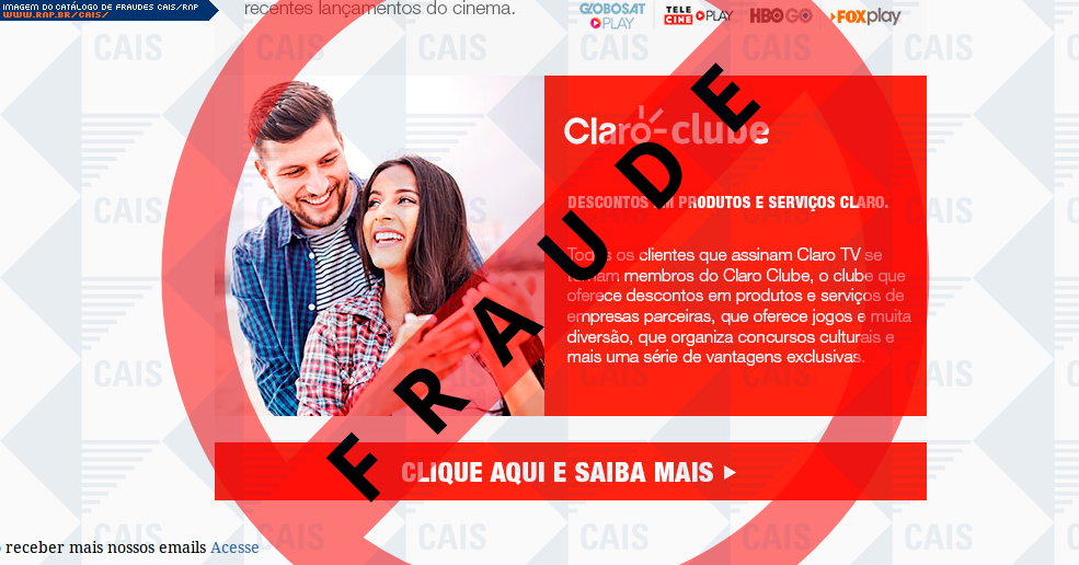 Esta página tem função informativa e educativa. Exibe uma coleção de imagens de phishing scam (fraudes eletrônicas) ou malware (código malicioso) veiculados por meio de spam (e-mail não-solicitado). Trata-se de conteúdo exemplificativo, não exaustivo, uma vez que não é possível contemplar todos os casos de fraudes existentes. Assim, caso você tenha conhecimento de um exemplar que não esteja aqui presente, isto não significa que não seja válido ou real. Inclusive incentivamos que você o envie para análise do CAIS para que, se for o caso, passe a integrar o nosso acervo.