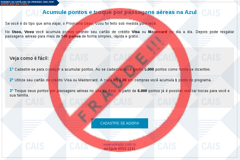 | comentário | O usuário recebe uma mensagem informando que há vantagens disponíveis relacionadas a sua conta na empresa aérea Azul sendo necessário fornecer algumas informações no link indicado, no entanto a página é falsa destinada a roubar os dados da vítima. | |