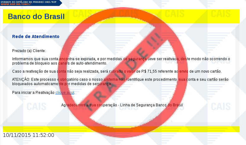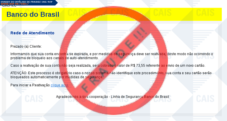 | comentário | A vítima recebe um email informando que sua conta no Banco do Brasil encontra-se expirada e que deve ser feita a reativação através de um link passado na mensagem. Entretanto o link leva a uma página falsa que tenta roubar informações bancárias da vítima. | |