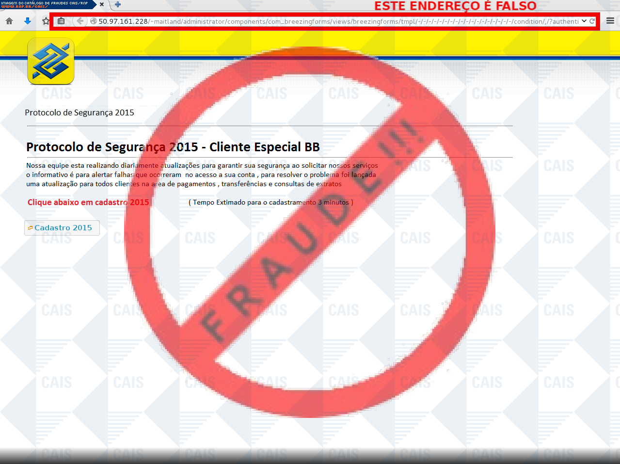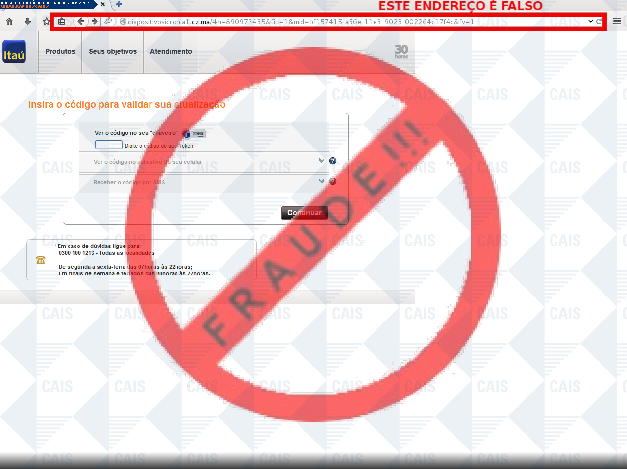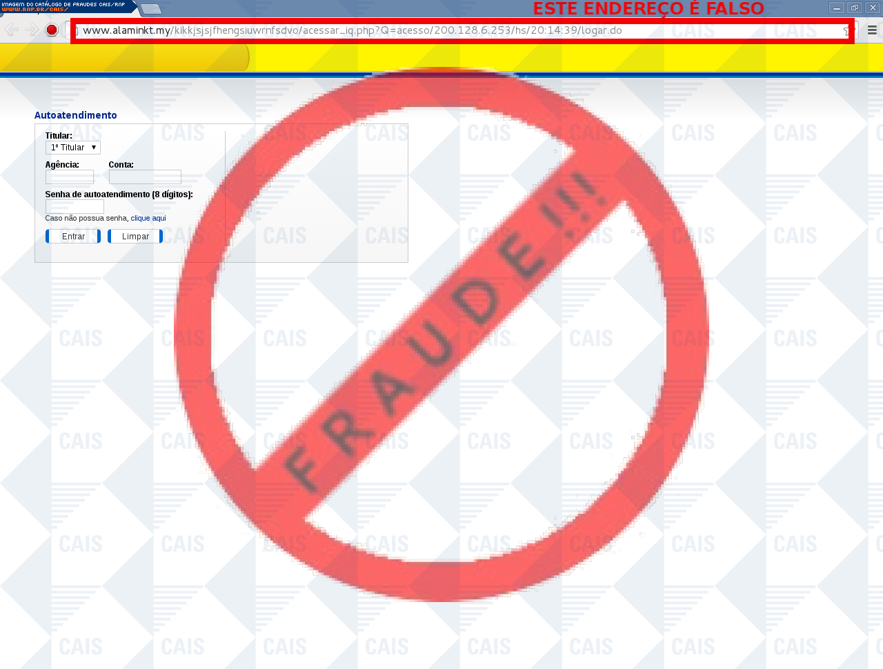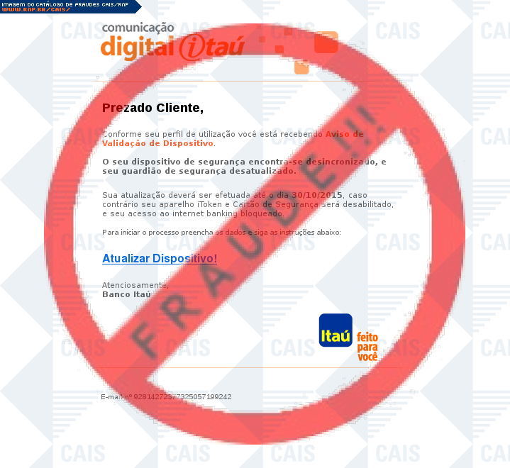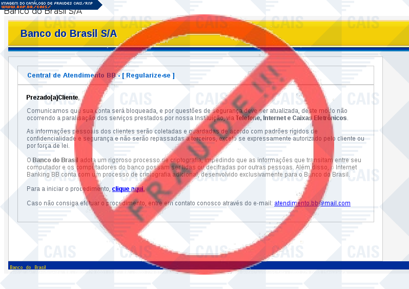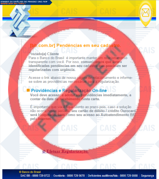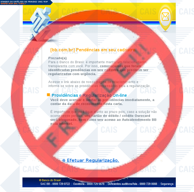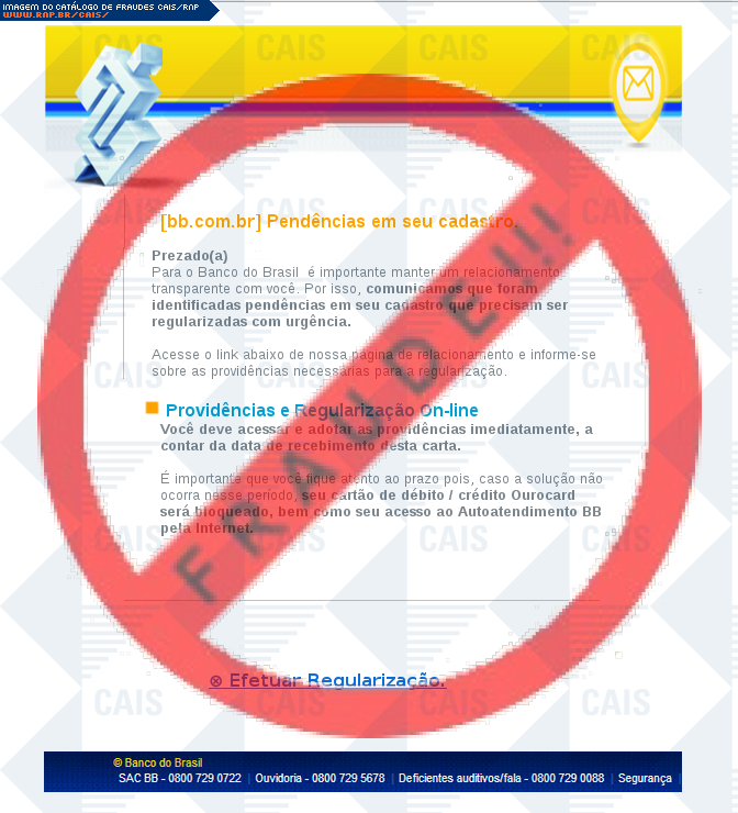Esta página tem função informativa e educativa. Exibe uma coleção de imagens de phishing scam (fraudes eletrônicas) ou malware (código malicioso) veiculados por meio de spam (e-mail não-solicitado). Trata-se de conteúdo exemplificativo, não exaustivo, uma vez que não é possível contemplar todos os casos de fraudes existentes. Assim, caso você tenha conhecimento de um exemplar que não esteja aqui presente, isto não significa que não seja válido ou real. Inclusive incentivamos que você o envie para análise do CAIS para que, se for o caso, passe a integrar o nosso acervo.