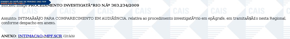 | comentário | Mensagem falsa se passando por intimação do Ministério Público Federal para comparecimento em audiência relativa a uma investigação. A mensagem fornece um link, que tenta se pasar por um anexo, através do qual seria possível obter mais informações sobre o... (leia mais) | |