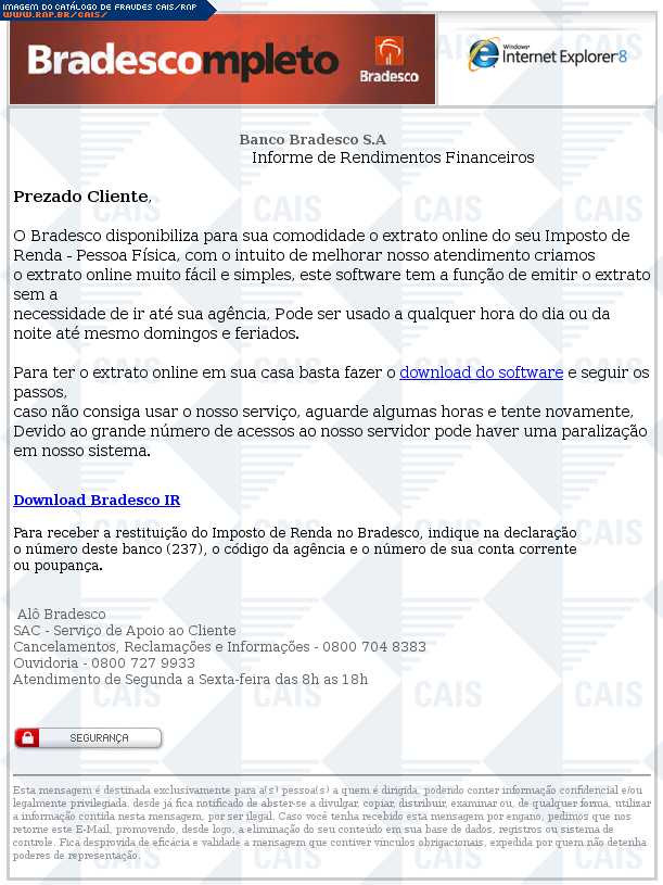 | comentário | Fraude que utiliza o nome do Banco Bradesco oferencendo o download de um novo software, que suposamente seria capaz de emitir extrato online do Imposto de Renda. O arquivo malicioso presente no link foi classificado como Trojan-Banker.Win32.Banker.amen. | |