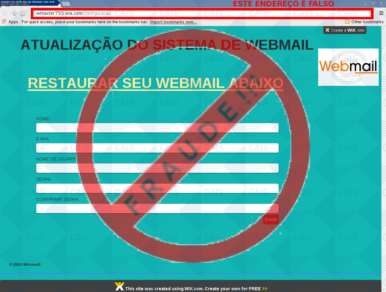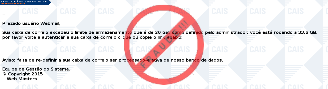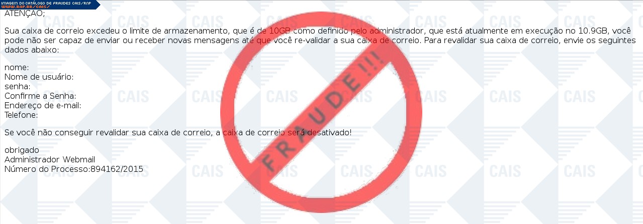 | comentário | O usuário recebe uma mensagem informando que sua conta de e-mail excedeu o limite de armazenamento sendo necessário realizar uma atualização, no entanto a página é falsa criada para roubar os dados de login da vítima. | |