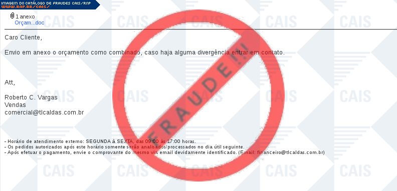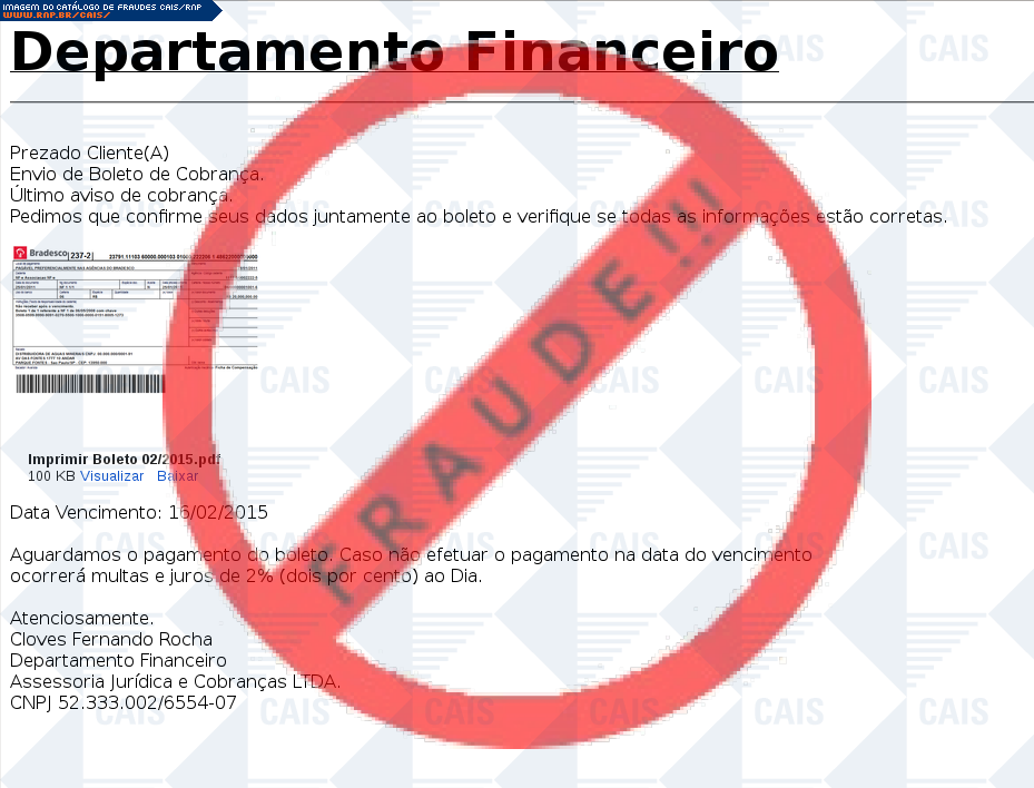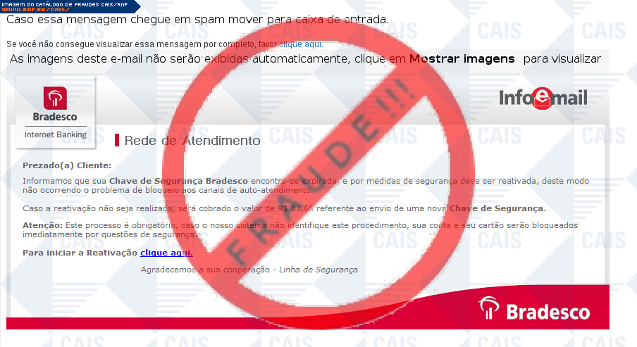 Esta página tem função informativa e educativa. Exibe uma coleção de imagens de phishing scam (fraudes eletrônicas) ou malware (código malicioso) veiculados por meio de spam (e-mail não-solicitado). Trata-se de conteúdo exemplificativo, não exaustivo, uma vez que não é possível contemplar todos os casos de fraudes existentes. Assim, caso você tenha conhecimento de um exemplar que não esteja aqui presente, isto não significa que não seja válido ou real. Inclusive incentivamos que você o envie para análise do CAIS para que, se for o caso, passe a integrar o nosso acervo.