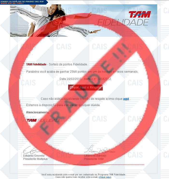 | comentário | O usuário recebe uma mensagem informando sobre o programa de fidelidade da companhia aérea TAM com o link para inscrição disponível. Entretanto o site é falso criado para roubar dados pessoais da vítima. | |