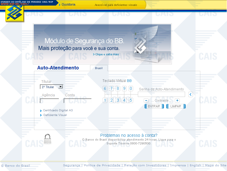 | comentário | Página falsa muito parecida com a página de auto-atendimento do Banco do Brasil. A página é usada para roubar informações da vítima como número da conta e senha de acesso ao Internet Banking. | |