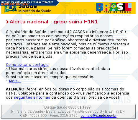 | comentário | Mensagem falsa se passando por alerta do Ministério da Saúde a respeito de alerta nacional relativo ao vírus da gripe suína (H1N1). O texto traz alguns números a respeito do alastramento do vírus pelo país (dados não confirmados) e fornece informações de... (leia mais) | |