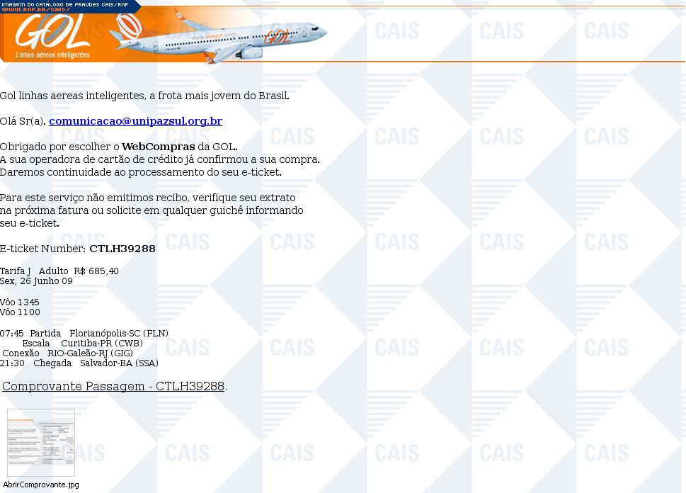 | comentário | Mensagem falsa se passando por confirmação de compra de passagem da GOL. A mensagem traz informações sobre valor, origem, destino, número de vôo, etc. Além disso é fornecida uma imagem de tamanho reduzido, ilegível, que seria do comprovante da compra. Para... (leia mais) | |