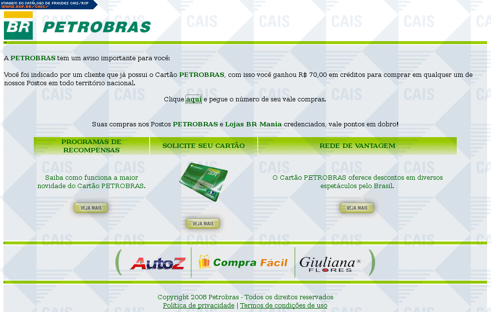 | comentário | Mensagem que se passa por um comunicado da Petrobrás, informando sobre um suposto crédito de R$70,00 que pode ser utilizado em postos da rede. Trata-se de um assunto bem oportuno, prêmios na forma de combustível são bem populares e atraentes. OBS. (1) o software... (leia mais) | |