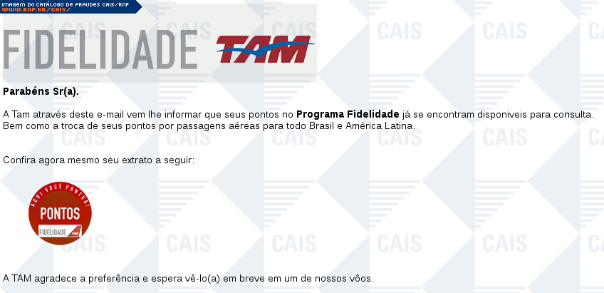 | comentário | Mensagem falsa se passando pela companhia aérea TAM informando a disponibilidade para consulta do extrato de pontos do plano fidelidade. Além disso é informado que tais pontos já podem ser utilizados para troca por passagens para o Brasil e para a América... (leia mais) | |