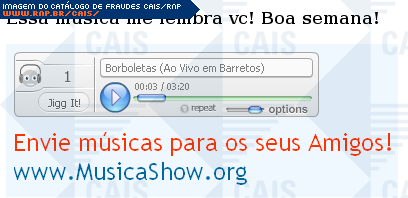 | comentário | Mensagem que seria de alguém conhecido passando um link de uma música em suposto site chamado MusicaShow. O link leva a um arquivo malicioso identificado como Trojan.Win32.Buzus.axps (F-Secure). | |