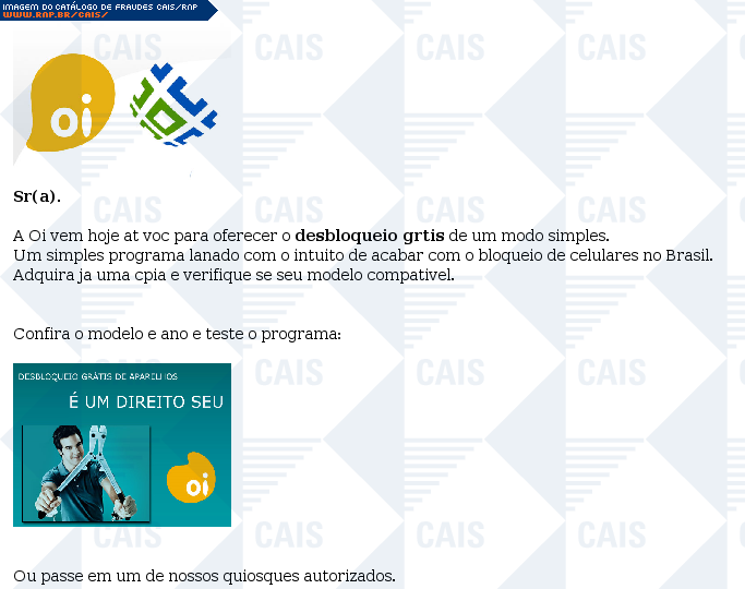| comentário | Fraude oferecendo software para desbloqueio de celular. A mensagem, que tenta se passar por mensagem direta da Oi, possui muitos erros de português e algumas imagens mal editadas de símbolos da Oi. Um link fornecido através de uma imagem levaria ao tal software... (leia mais) | |