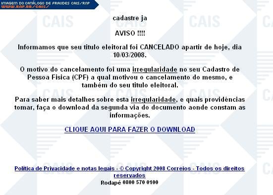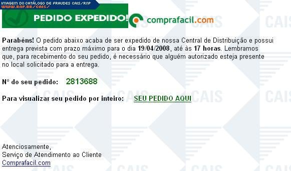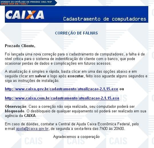 Esta página tem função informativa e educativa. Exibe uma coleção de imagens de phishing scam (fraudes eletrônicas) ou malware (código malicioso) veiculados por meio de spam (e-mail não-solicitado). Trata-se de conteúdo exemplificativo, não exaustivo, uma vez que não é possível contemplar todos os casos de fraudes existentes. Assim, caso você tenha conhecimento de um exemplar que não esteja aqui presente, isto não significa que não seja válido ou real. Inclusive incentivamos que você o envie para análise do CAIS para que, se for o caso, passe a integrar o nosso acervo.