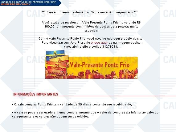 | comentário | Fraude que utiliza o nome da loja PontoFrio informando sobre um vale presente de R$ 100,00. O link malicioso atrelado a fraude, ValePresente.exe, foi identificado por antivirus como Trojan-Spy.Win32.Banker | |