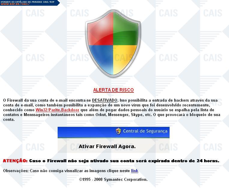 | comentário | Fraude que utiliza o nome da empresa de antivirus Symantec informando que o firewall da conta de e-mail está desativado e caso o firewall não seja ativado a conta vai ser cancelada em 24 horas. O arquivo malicioso atrelado a fraude, firewall.exe, foi identificado... (leia mais) | |
