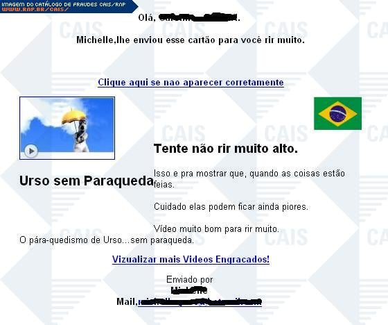 | comentário | Esta fraude de um suposto vídeo de um urso de paraquedas, chega através do e-mail de alguem que foi infectado que utiliza os dados do MSN para se propagar. No campo assunto o texto vem com o nome do destinatário e o comentário do MSN que foi colocado, por... (leia mais) | |