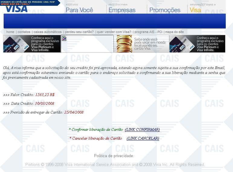 | comentário | Fraude que utiliza o nome da operadora de cartões VISA informando que o crédito foi pré-aprovado e que o cartão será emitido após a confirmação. A mensagem fraudulenta possui dois links, confirmar e cancelar, que apontam para o mesmo arquivo, fatura.scr,... (leia mais) | |