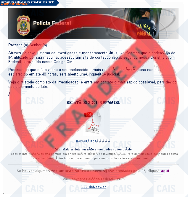 | comentário | A vítima recebe uma mensagem, informando que o endereço do IP, utilizado por sua máquina, acessou um site de conteúdo ilegal. Mas ao clicar no link para visualizar o relatório da investigação, inicia-se o download de um malware. | |