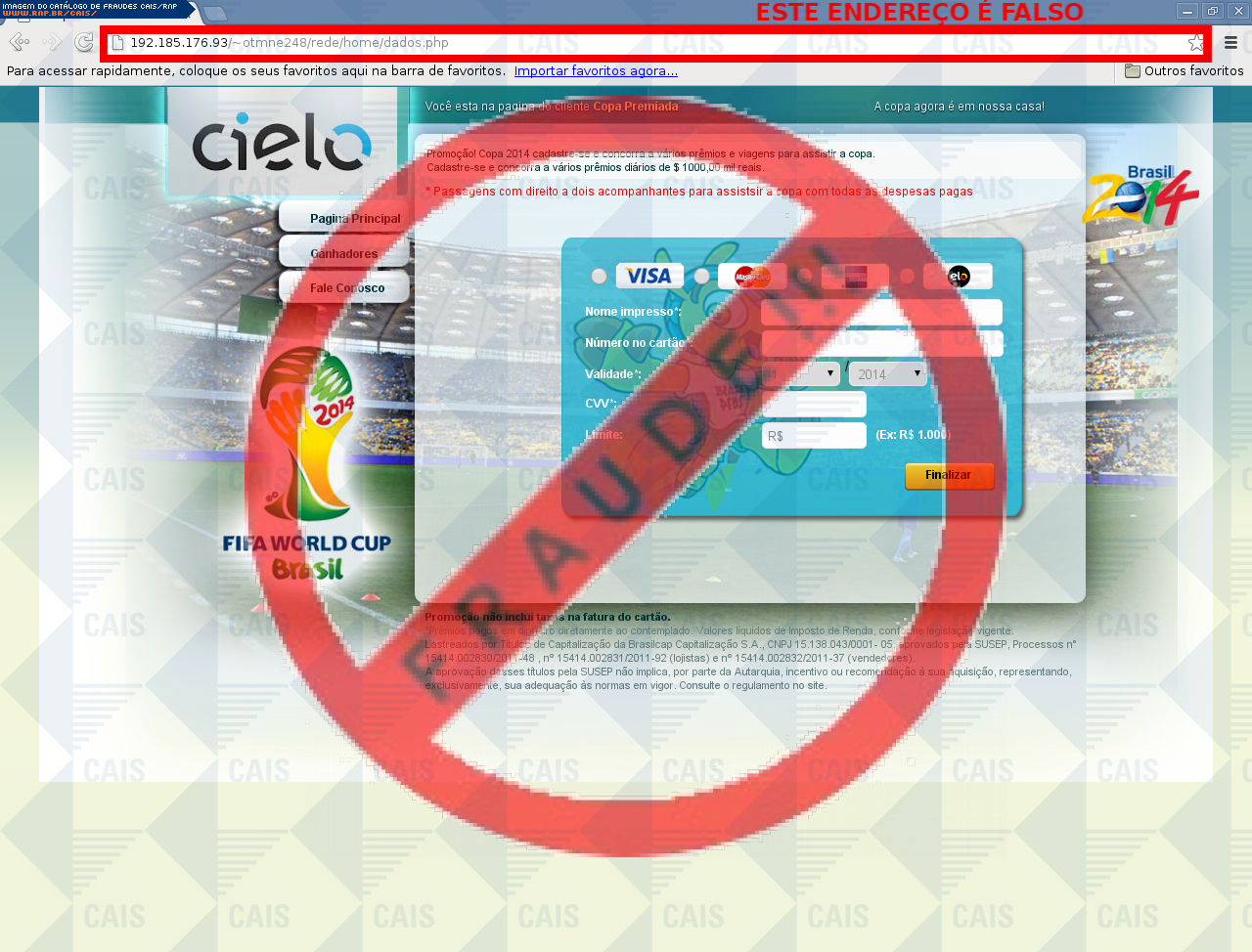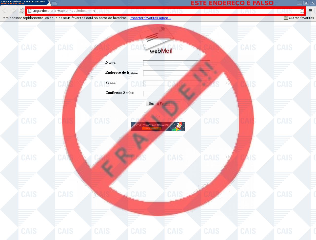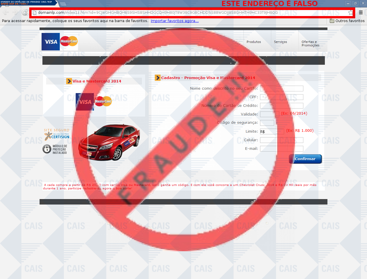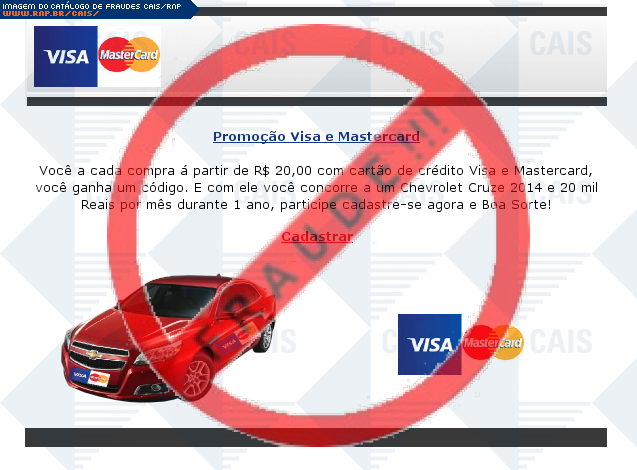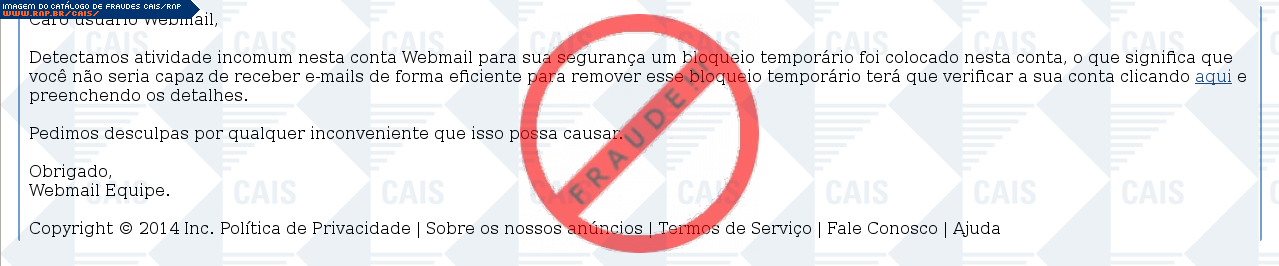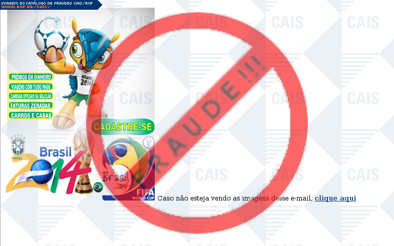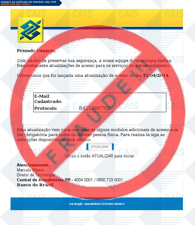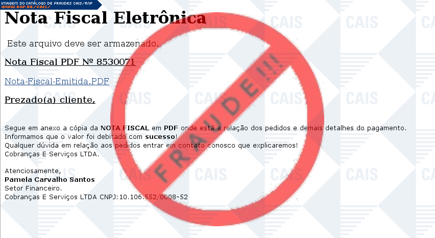 Esta página tem função informativa e educativa. Exibe uma coleção de imagens de phishing scam (fraudes eletrônicas) ou malware (código malicioso) veiculados por meio de spam (e-mail não-solicitado). Trata-se de conteúdo exemplificativo, não exaustivo, uma vez que não é possível contemplar todos os casos de fraudes existentes. Assim, caso você tenha conhecimento de um exemplar que não esteja aqui presente, isto não significa que não seja válido ou real. Inclusive incentivamos que você o envie para análise do CAIS para que, se for o caso, passe a integrar o nosso acervo.