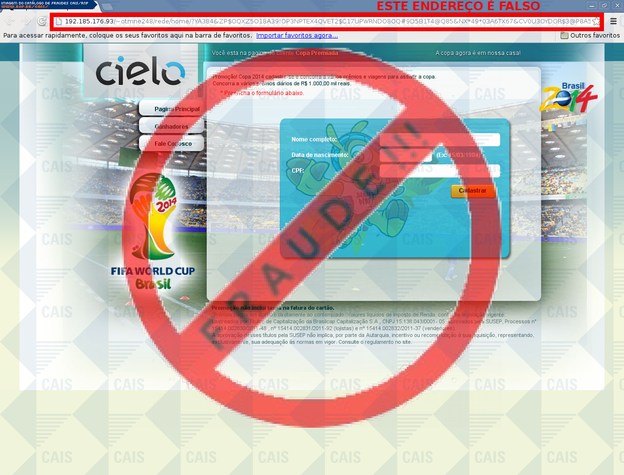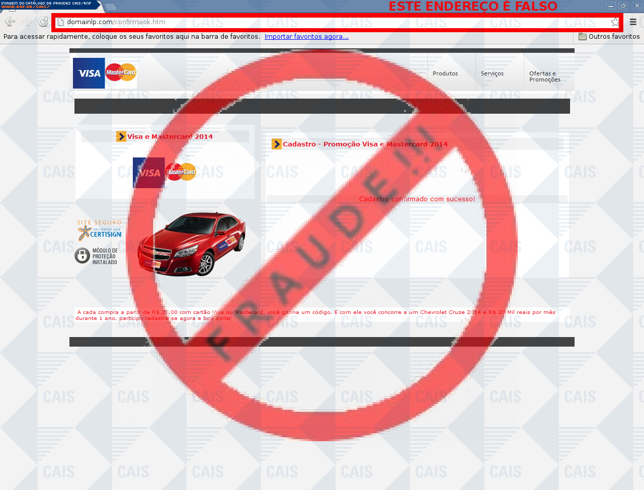 |   |  Fraudes identificadas e divulgadas pelo CAISA partir de 2008, todas as fraudes identificadas pelo CAIS estão sendo ordenadas de acordo com a data de distribuição e disponibilizadas para consulta, com o intuito de conscientizar a comunidade sobre os principais golpes que estão em circulação. Adicionalmente, o CAIS envia alertas de segurança através da lista CAIS Alerta quando uma fraude mostra-se particularmente perigosa aos usuários de computadores. Reporte fraudes: