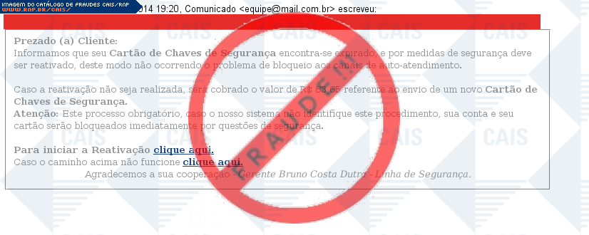 | comentário | A vítima recebe uma mensagem do banco, informando que seu cartão de chaves de segurança encontra-se expirado, mas ao clicar no link para reativação, a vítima é direcionada para uma página falsa, que é usada na prática de phishing. | |