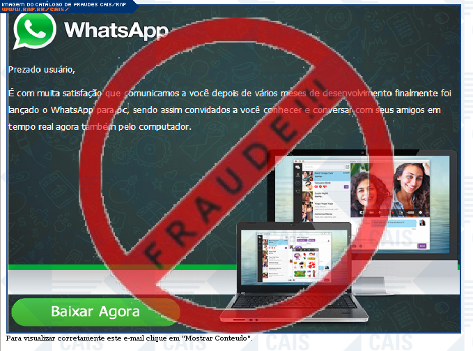 | comentário | A vítima recebe uma mensagem, informando que foi lançado o aplicativo whatsapp para computador, mas ao clicar no link, inicia-se o download de um software malicioso. | |