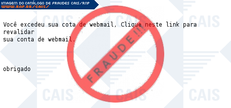 | comentário | A vítima recebe uma mensagem, informando que excedeu sua cota de email, e é necessário clicar no link para revalidar a sua conta. Mas ao clicar no link, a vítima é direcionada para uma página falsa, onde pede seu usuário e senha para poder roubar sua conta.... (leia mais) | |