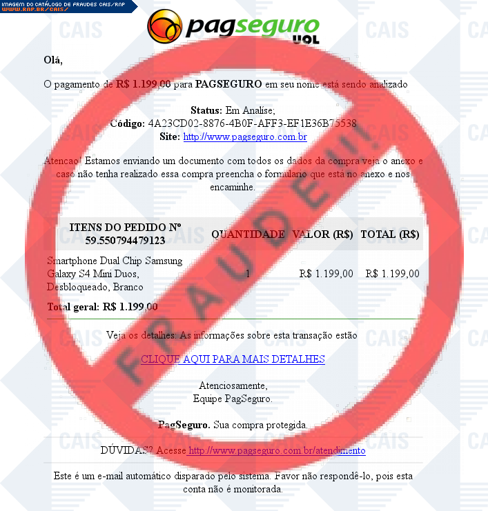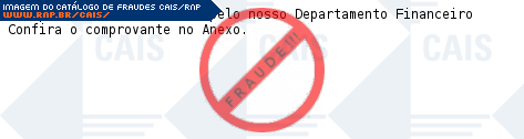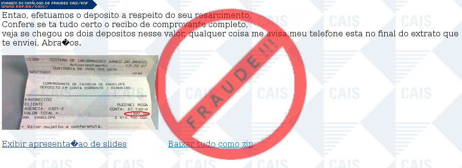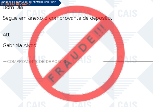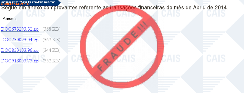 Esta página tem função informativa e educativa. Exibe uma coleção de imagens de phishing scam (fraudes eletrônicas) ou malware (código malicioso) veiculados por meio de spam (e-mail não-solicitado). Trata-se de conteúdo exemplificativo, não exaustivo, uma vez que não é possível contemplar todos os casos de fraudes existentes. Assim, caso você tenha conhecimento de um exemplar que não esteja aqui presente, isto não significa que não seja válido ou real. Inclusive incentivamos que você o envie para análise do CAIS para que, se for o caso, passe a integrar o nosso acervo.