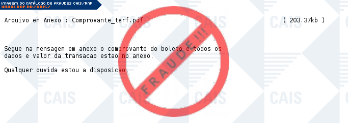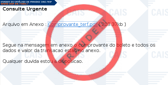 | comentário | O usuário recebe uma mensagem contendo comprovante do boleto com os dados da transação, porem trata-se de um arquivo malicioso intitulado BackDoor.Infector.133 | |