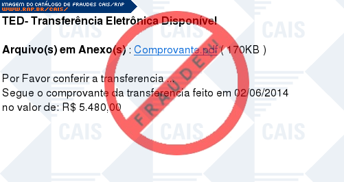 | comentário | A vítima recebe uma mensagem, contendo um comprovante de transferência eletrônica em anexo, mas ao clicar no link, inicia-se o download de um malware, identificado como Trojan.Win32.Generic.AD. | |