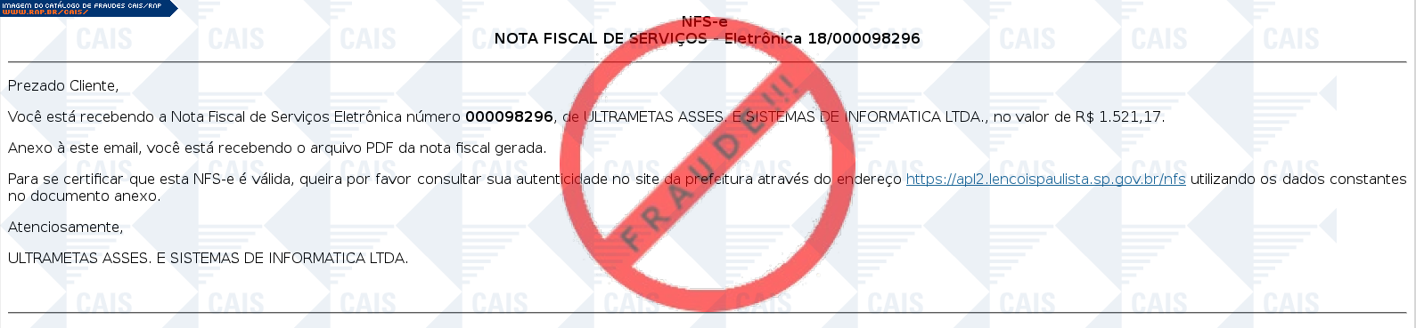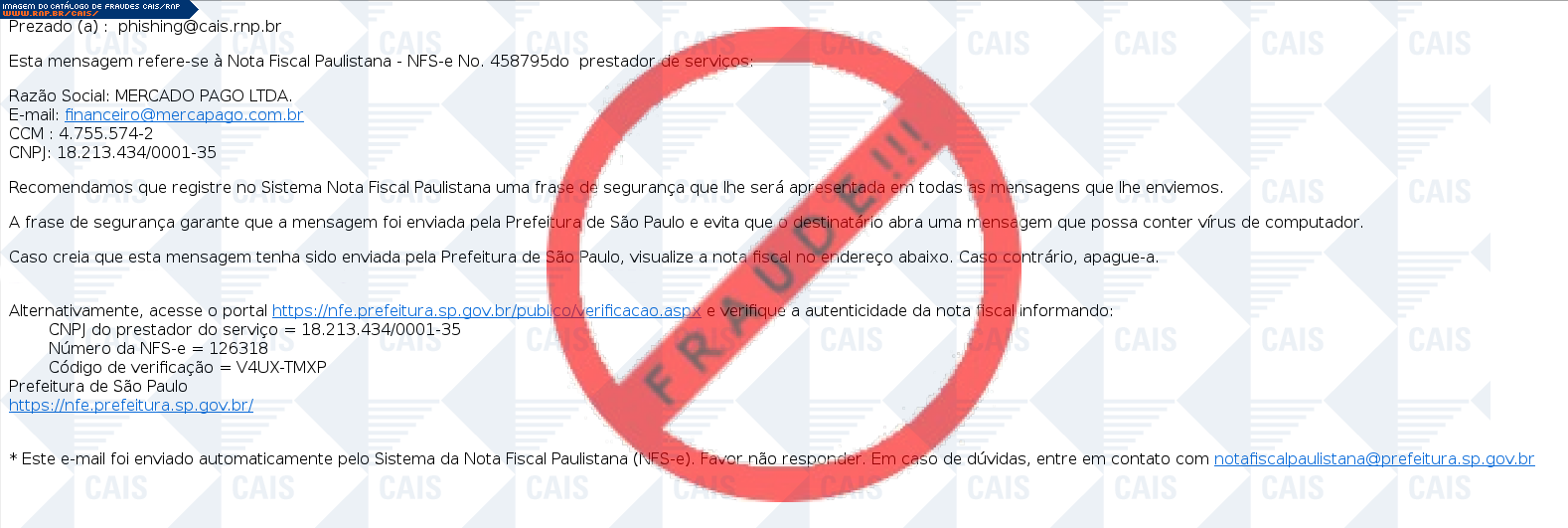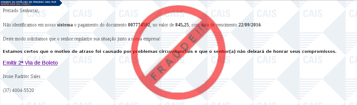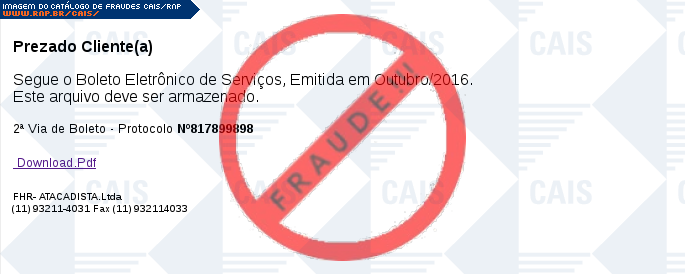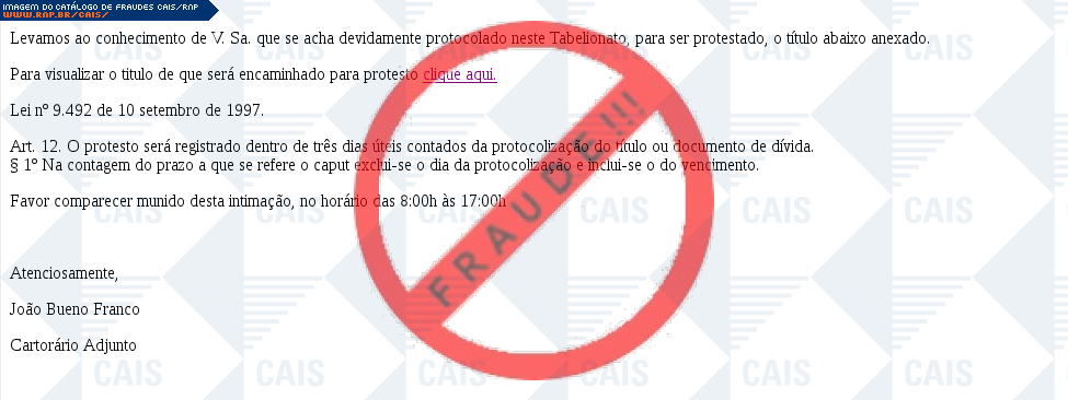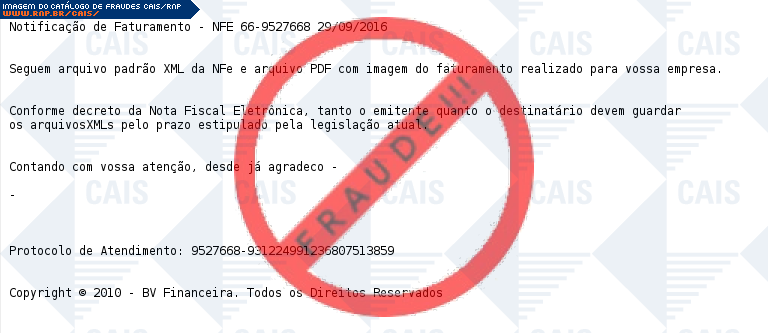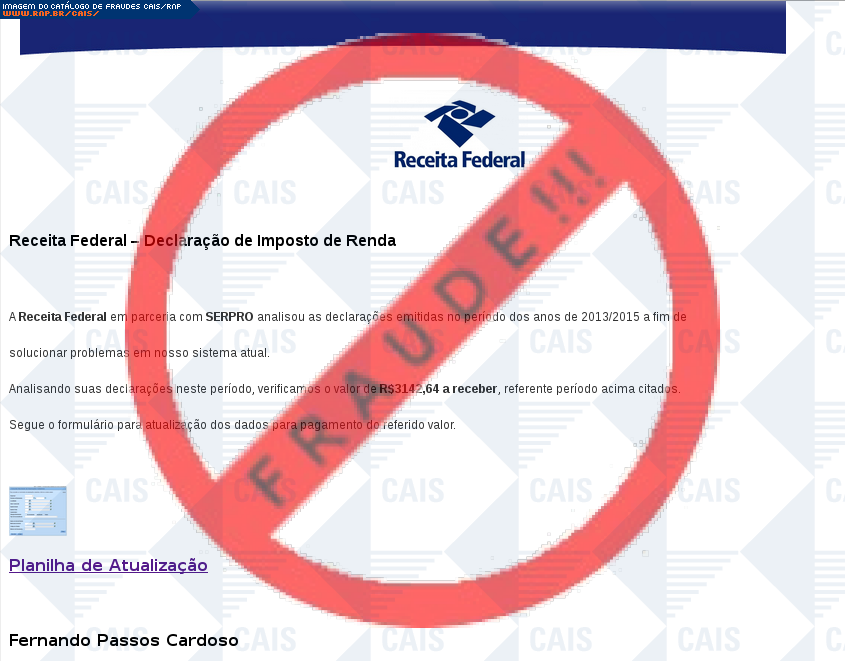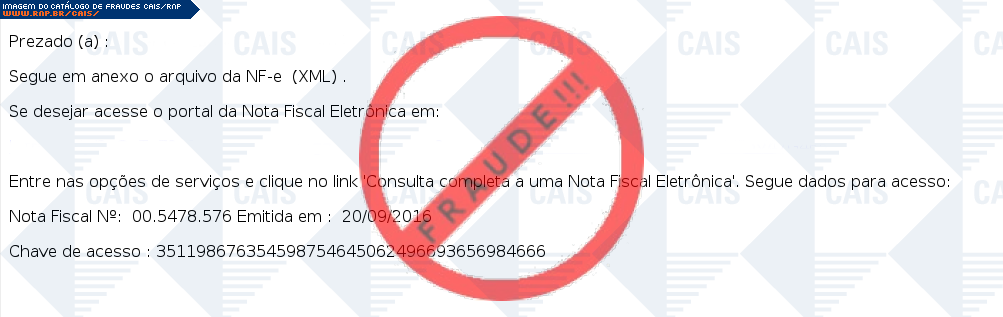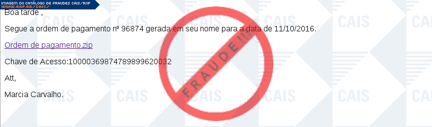 Esta página tem função informativa e educativa. Exibe uma coleção de imagens de phishing scam (fraudes eletrônicas) ou malware (código malicioso) veiculados por meio de spam (e-mail não-solicitado). Trata-se de conteúdo exemplificativo, não exaustivo, uma vez que não é possível contemplar todos os casos de fraudes existentes. Assim, caso você tenha conhecimento de um exemplar que não esteja aqui presente, isto não significa que não seja válido ou real. Inclusive incentivamos que você o envie para análise do CAIS para que, se for o caso, passe a integrar o nosso acervo.