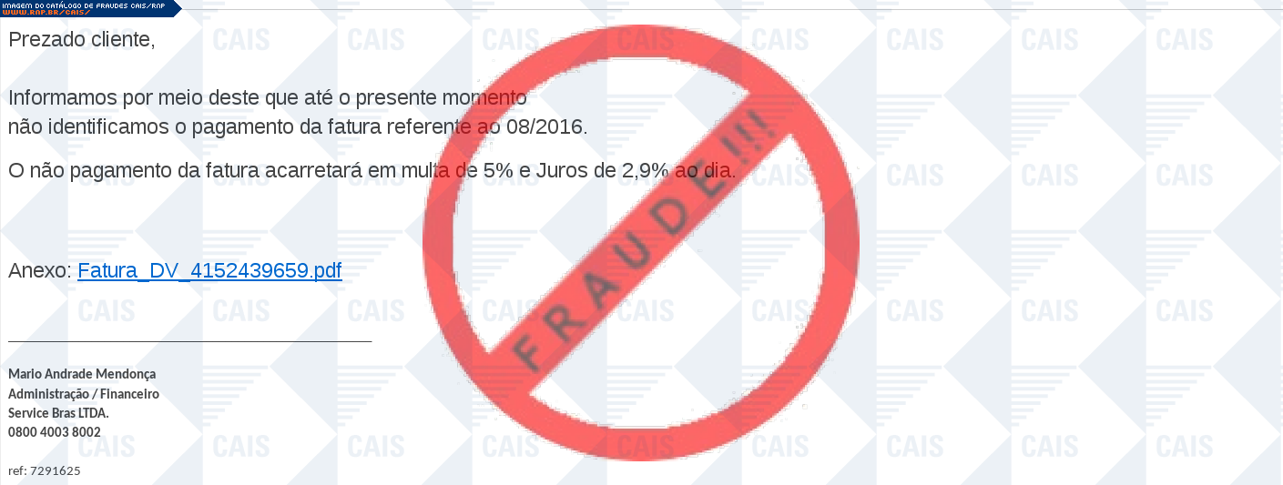 | comentário | O usuário recebe uma mensagem contendo uma fatura em atraso disponível para download, no entanto o arquivo originado é malicioso criado para roubar informações da vítima e instalar outros arquivos fraudulentos com o nome de Trojan.Java.Banload.L. | |