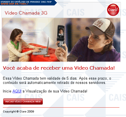 | comentário | Mensagem que se passa por uma video chamada da Claro com validade de 5 dias. O link para visualização do vídeo redireciona o usuário para um site malicioso com o software VideoChamada3g.exe, indentificado como Mal/Banload-I (Sophos). | |