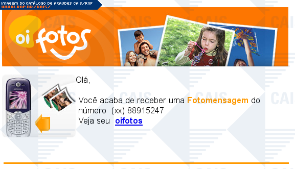 | comentário | Mensagem que se passa pela operadora Oi, indicando que a pessoa recebeu uma fotomensagem de um celular. O link para as fotos guarda o software malicioso Suspicious:W32/Malware!Gemini (F-Secure). | |