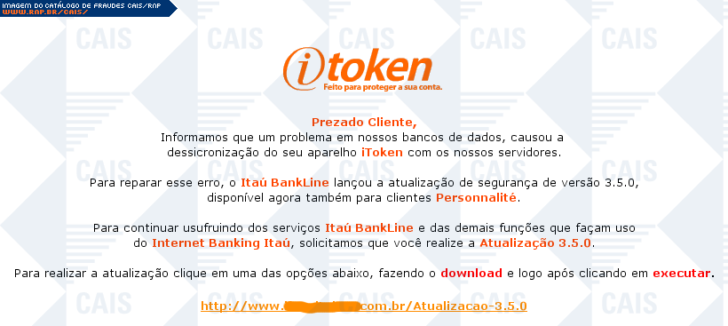 | comentário | Mensagem que se passa por um comunicado do banco Itaú, informando que o dispositivo eletrônico "iToken" do usuário perdeu a sincronia com os servidores do banco. O usuário é instruído a fazer uma atualização de segurança para a versão 3.5.0, que guarda o... (leia mais) | |